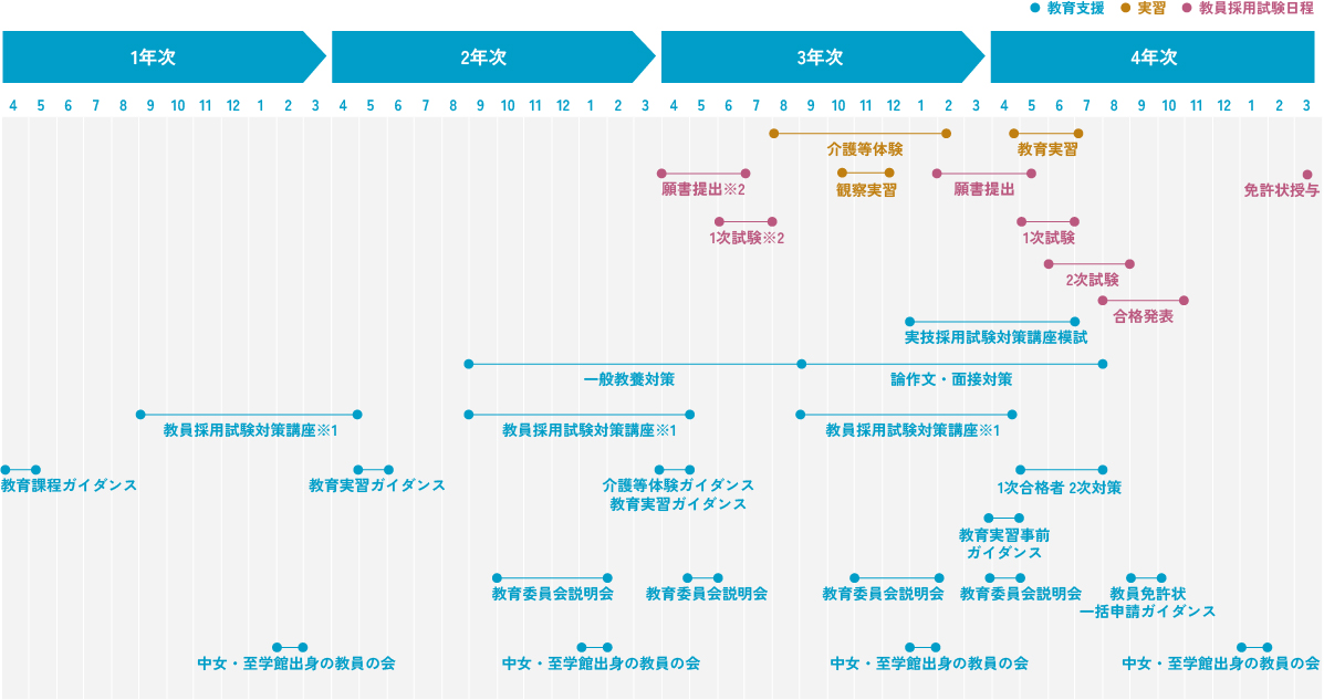 至学館大学は、50年以上にわたって教員を輩出してきた実績を基に教員養成をおこない、毎年20名以上の卒業生が教員として採用されています。 教職課程と教職支援室が連携して教員採用試験に向けたスケジュールを体系化し、学生本人の考えに基づいたサポートによって教員の資質を確実に身につけるための指導をしています。 さらには、教員採用試験対策講座、学内模試4回の実施を8か月間にわたって学内で開講するなど、万全のサポート体制を整えています。