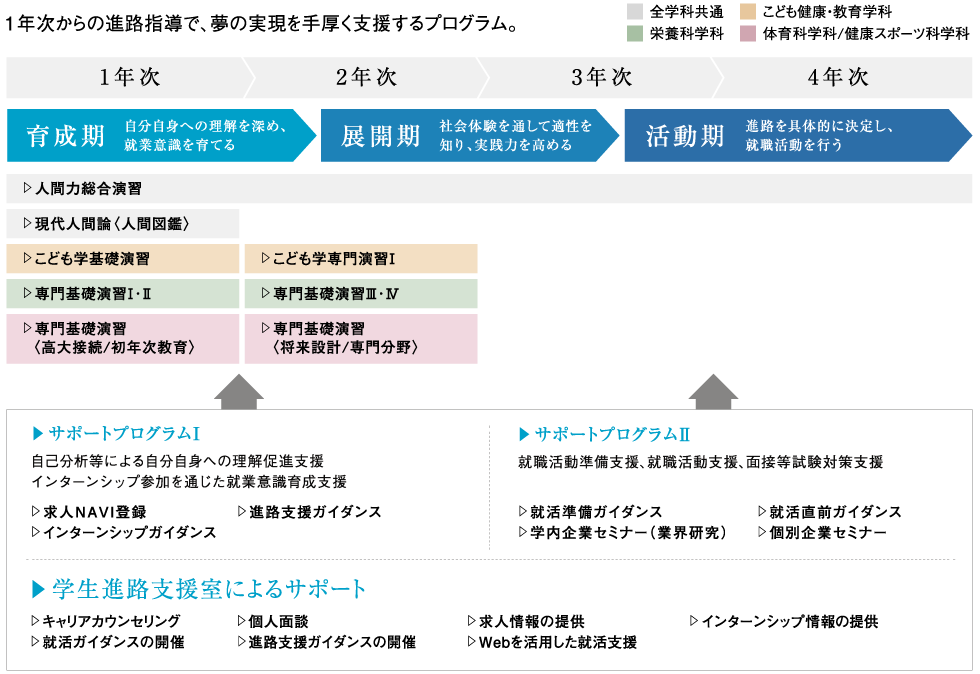さまざまな進路支援プログラムを実施しているほか、学生の進路や就職先への不安を解消するために全スタッフがいつでも相談に応じています。