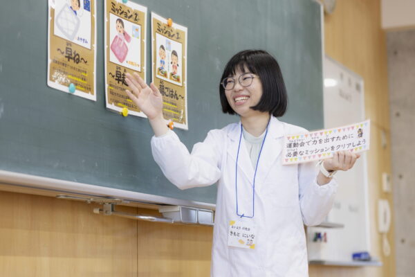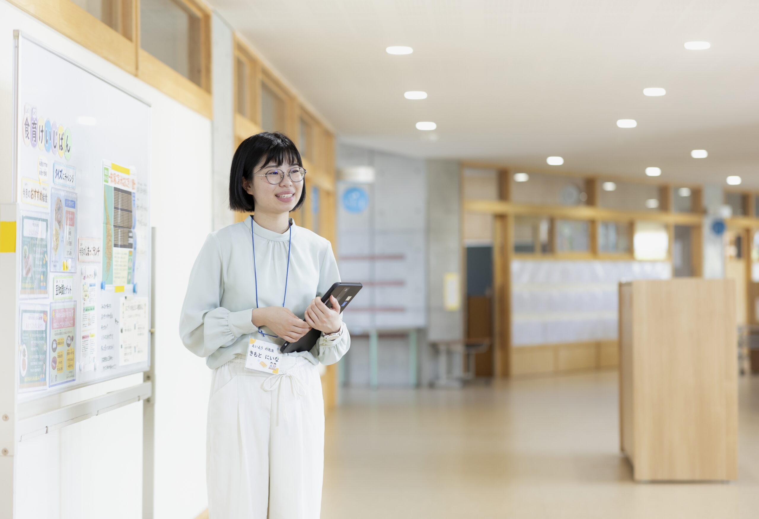 現在私は、地元である三重県で栄養教諭をしています。 勤務する志摩市では、市内全ての小中学校の給食を給食センターで調理しており、13校、2800食分の献立作成から食材の発注、調理員への指示や衛生管理などを、私を含めた3名の栄養士で行います。 現場で学ぶことも多く、例えば献立作成では、センターでの作業動線や工程数、調理員の人数などを考慮しなければなりません。 また、栄養教諭として小中学校にも足を運び、給食の巡回や食育の授業、食育コーナーへの掲示も重要な仕事です。 こどもにもわかりやすく食を伝える資料や掲示物の作成には、大学や大学院で学んだ表現力が生かされています。 学校では「今日の給食、美味しかった」「こんな給食を作ってほしい」といった、こどもたちのリアルな声を聞けることができることが、大きな励みになっています。